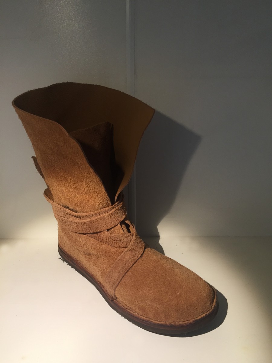 An der Ferse ohne Teilungsnaht, jedoch Ferse von innen verstärkt Lederbänder zum schnüren